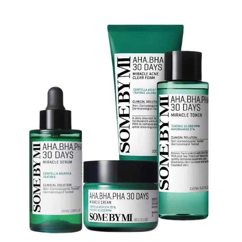 ערכת טיפוח קוריאנית של SOMEBYMI עם AHA BHA PHA, Tea Tree ו-Centella לטיפול בעור שמן או רגיש ולמראה חלק וזוהר תוך 30 יום.